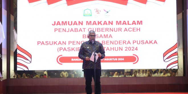Hal tersebut disampaikan oleh Penjabat Gubernur Aceh Bustami Hamzah, dalam sambutannya usai menjamu makan malam Pasukan Pengibar Bendera Pusaka (PASKIBRAKA) Dalam Rangka Peringatan HUT Kemerdekaan RI ke 79, di Anjong Mon Mata komplek Meuligoe Gubernur Aceh, Sabtu (17/8/2024).