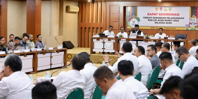 Banda Aceh – Penjabat (Pj) Gubernur Aceh, Dr. H. Safrizal ZA, M.Si., menggelar rapat koordinasi penting terkait dukungan pelaksanaan Pekan Olahraga Nasional (PON) XXI Aceh-Sumut 2024 di wilayah Aceh. Rapat tersebut berlangsung di Gedung Serbaguna Sekretariat Daerah Aceh pada Rabu, 28 Agustus 2024.