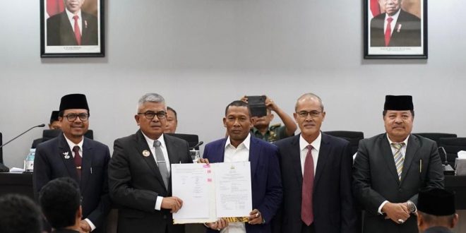 BANDA ACEH – Penjabat (Pj) Gubernur Aceh Bustami Hamzah, menyerahkan Rancangan KUA-PPAS Tahun Anggaran 2025 kepada Ketua DPRA Zulfadli, pada Rapat Paripurna Dewan Perwakilan Rakyat Aceh Tahun 2024, dalam rangka Penyerahan Rancangan KUA-PPAS Tahun Anggaran 2025, di ruang Serbaguna DPRA, Selasa (16/7/2024) sore.