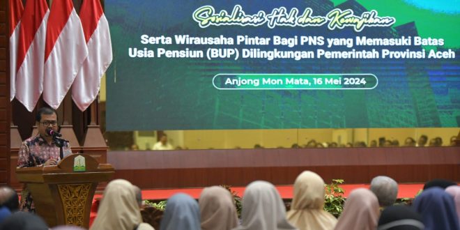 Hal tersebut disampaikan oleh Penjabat (Pj) Sekretaris Daerah Aceh Azwardi, saat membacakan sambutan Gubernur Aceh, pada Rapat Koordinasi Sosialisasi dan Penyerahan SK Pensiun kepada Calon Pensiunan ASN di lingkungan Pemerintah Aceh, di Anjong Mon Mata Komplek Meuligoe Gubernur Aceh, Kamis (16/5/2024).