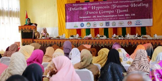 Hj. Samsiarni Dermawan, Ketua Panitia Pelatihan Hypnosis Trauma Healing Pasca Gempabumi, menyebutkan kegiatan pelatihan bagi guru konseling tersebut merupakan aksi dari kepedulian organisasi perempuan peduli Pidie Jaya. Istri Sekda Aceh tersebut mengatakan mereka ingin berbagi bersama untuk mengurangi beban masyarakat akibat beban secara psokologi paska gempa.