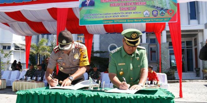 Pantauan dilapangan usai memberikan sambuat, Plt Bupati Bener Meriah Drs. Hasanuddin Darjo, MM bersama Kapolres Bener Meriah AKBP. Deden Somantri. S.I.K, M.Si melakukan penandatangan surat serah terima anggota satuan perlindungan masyarakat.(Humas Setdakab Bener Meriah)