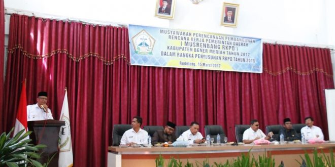 REDELONG : Pelaksana Tugas Bupati Kabupaten Bener Meriah Drs. H. Rusli M Saleh membuka acara Musyawarah Rencanaan dan Pembangunan (Musrenbang) Rencana Kerja Pembangunan Daerah (RKPD) Tahun 2018 di Aula Setdakab setempat, Rabu (15/3)