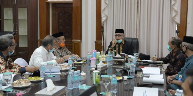 Banda Aceh – Plt. Gubernur Aceh, Nova Iriansyah, memimpin rapat membahas prosedur operasional standar (POS) mekanisme proses pembelajaran tatap muka di Sekolah dalam fase new normal di Pendopo Gubernur Aceh, Kamis (9/7/2020).