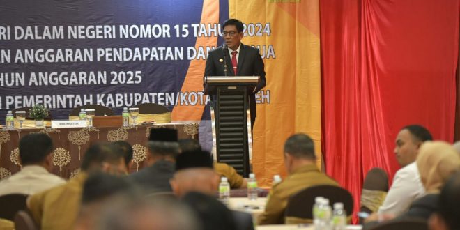 BANDA ACEH— Plt Sekda Aceh Muhammad Diwarsyah, membuka kegiatan sosialisasi Peraturan Menteri Dalam Negeri Nomor 15 Tahun 2025 tentang Pedoman Penyusunan Anggaran Pendapatan dan Belanja Daerah Tahun Anggaran 2025, di Hotel Grand Nanggroe, Senin, (4/11/2024).