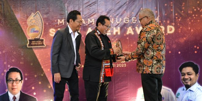 TAKENGON – Sekretaris Daerah (Sekda) Aceh Bustami Hamzah, menerima Award sebagai Birokrat Berdedikasi dan Berintegritas dari Serikat Media Siber Indonesia (SMSI) Aceh, pada acara Malam Anugerah SMSI Aceh tahun 2023, yang digelar di Ball Room Parkside Hotel, Senin (8/5/2023) malam.