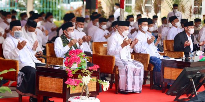 BANDA ACEH–Sekretaris Daerah (Sekda) Aceh, Taqwallah, mengikuti zikir dan doa rutin keselamatan pandemi Pemerintah Aceh bersama seribuan santri di halaman Asrama Haji Aceh, Jumat, (22/10/2021).