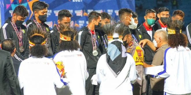 JAYAPURA – Sekretaris Daerah (Sekda) Aceh, dr Taqwallah, MKes mengalungkan medali perak kepada skuat sepak bola Aceh, seusai pertandingan grand final Pekan Olahraga Nasional (PON) yang dilaksanakan di Stadion Mandala, Jayapura, sekira pukul 16.30 waktu setempat, pada Kamis, 14 Oktober 2021.