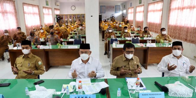 Sekda Aceh, dr.Taqwallah, M.Kes, didampingi Kadisdik Aceh, Drs.Alhudri, MM, Kadisdik Dayah, Zahrol, Fajri, S.Ag, MH, Kadinkes, dr.Hanif, Karo Organ Setda Aceh, Daniel Arca, A.Ks, M.Si mengikuti zikir dan doa bersama memohon dijauhkan dari wabah dan bencana Covid-19 yang diikuti oleh seluruh ASN Pemerintah Aceh secara virtual, di SMA Negeri 1 Banda Aceh, Selasa, (12/10/2021).
