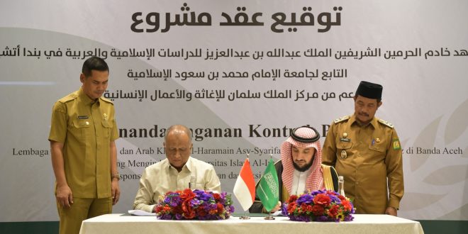 Banda Aceh – Sekretaris Daerah (Sekda) Aceh M. Nasir menghadiri dan menyaksikan langsung penandatanganan akad pembangunan Gedung Lembaga Pendidikan Bahasa Arab Khadim al-Haramain al-Syarifain Raja Abdullah bin Abdulaziz, Senin (6/10) di Hotel Ayani, Banda Aceh.