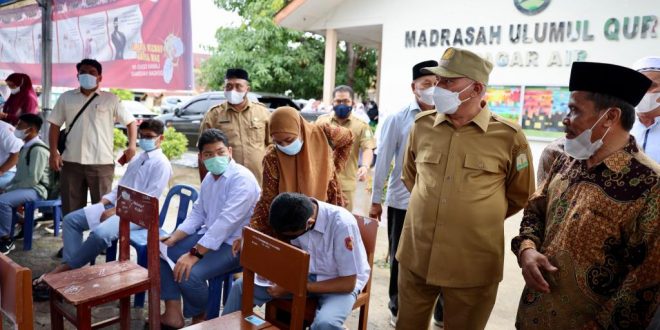 BANDA ACEH–Sekretaris Daerah Aceh, Taqwallah, menyemangati para santri dan siswa di Aceh Besar yang mengikuti vaksinasi Covid-19 di lembaga pendidikannya pada Selasa, (28/9/2021). Ia berharap pembelajaran tatap muka dapat digelar kembali secara sempurna setelah seluruh siswa maupun santri divaksin.