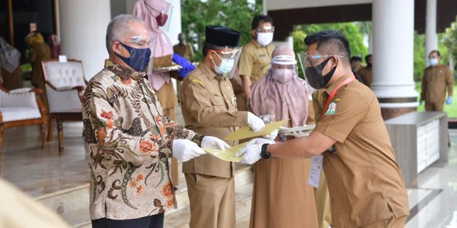 Banda Aceh – Sekretaris Daerah Aceh, dr. Taqwallah, M.Kes., menyerahkan 911 Surat Keputusan Kenaikan Pangkat dan Pensiunan bagi para Aparatur Sipil Negara (ASN) tingkat provinsi, Selasa (1/9/2020).