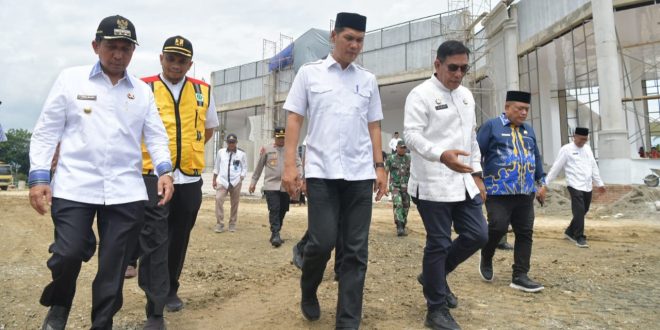 MEUREUDU— Sekretaris Daerah (Sekda) Aceh, M Nasir, meninjau progres pembangunan gedung utama arena Musabaqah Tilawatil Qura’n (MTQ) ke-35 tingkat provinsi Aceh , di kawasan perkantoran Bupati Pidie Jaya, Jumat, (22/8/2025).