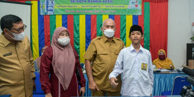BANDA ACEH–Sekretaris Daerah (Sekda) Aceh, Taqwallah, meninjau langsung pelaksanaan vaksinasi Covid-19 bagi siswa yang digelar di sejumlah sekolah dalam Kota Banda Aceh, Senin, (27/9/2021). Peninjauan itu dilakukan untuk memotivasi dan menyemangati langsung guru, murid dan tim vaksinator agar vaksinasi di lingkungan sekolah berjalan lancar serta segera tuntas.