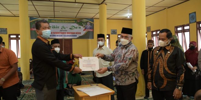 Sekretaris Daerah Aceh, dr. Taqwallah, M.Kes., menandatangani sekaligus menyerahkan sertifikat kepada Kepala Sekolah dan Wali Kelas yang sudah berhasil vaksinasi Covid-19 diatas 95% di SMA Negeri 1 Blangkejeren, Kamis (7/10/2021).