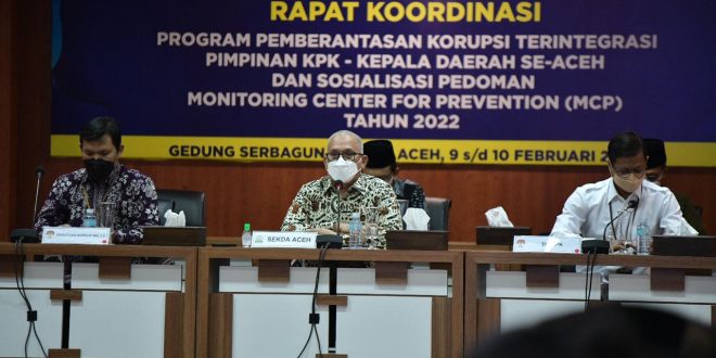 Sekretaris Daerah Aceh, dr. Taqwallah, M. Kes didampingi Para Asisten mengikuti Rapat Koordinasi Program Pemberantasan Korupsi Terintegrasi Pimpinan KPK-Kepala Daerah Se-Aceh dan Sosialisasi Pedoman Monitoring Center For Prevention (MCP) Tahun 2022 di Gedung Serbaguna Setda Aceh, Banda Aceh, Kamis (10/2/2022).