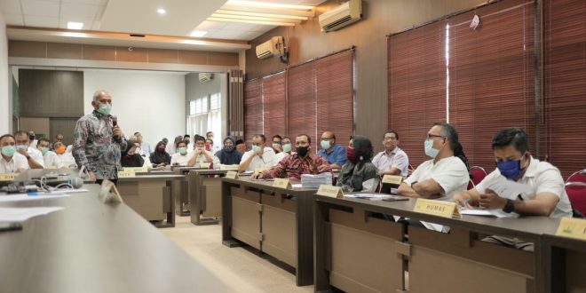 Sekretaris Daerah Aceh dr. Taqwallah, M.Kes memimpin rapat tindak lanjut laporan dan panduan jadwal donor darah ASN tahap 2 di ruang rapat P2K Aceh, Banda Aceh, Jum'at (26/6/2020).