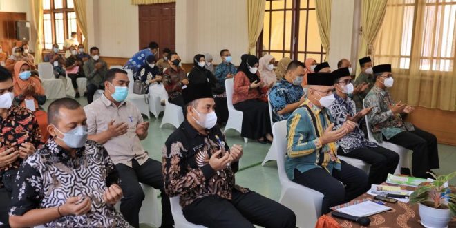 BANDA ACEH – Sekretaris Daerah (Sekda) Aceh, dr. Taqwallah, mengikuti zikir dan doa pagi dari Aula Badan Pengembangan Sumber Daya Manusia (BPSDM) Aceh, Kamis 30 Desember 2021. Bersama Sekda juga ada Asisten III, Kepala BPSDM, Kepala Badan Kepegawaian Aceh dan 44 Aparatur Sipil Negara (ASN), alumni penerima beasiswa pemerintah Aceh.