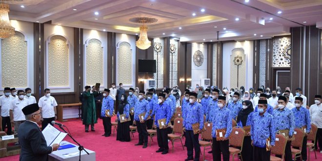 BANDA ACEH – Sebanyak 21 orang pejabat struktural pada Dinas Pendidikan Aceh dilantik dan diambil sumpah jabatan di aula Dinas Pendidikan, Jumat pagi Jumat 7 Januari 2022. Pelantikan dilakukan Sekretaris Daerah (Sekda) Aceh Taqwallah atas nama Gubernur Aceh.