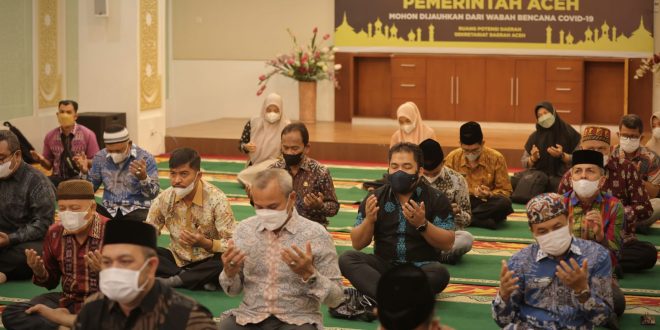 BANDA ACEH – Sekretaris Daerah (Sekda) Aceh mengikuti zikir dan doa bersama dari Kantor Badan Penghubung Pemerintah Aceh di Jakarta, Kamis 23/12/2021.