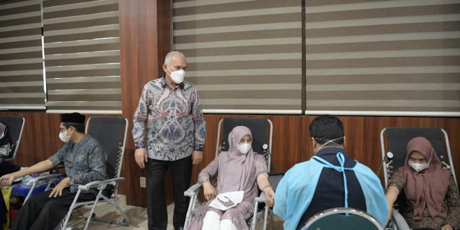 Banda Aceh – Sekretaris Daerah Aceh Taqwallah memantau pelaksanaan donor darah Aparatur Sipil Negara di lingkungan Pemerintah Aceh yang berlangsung Kamis 22 Juli 2021 di Gedung Serbaguna, Sekretariat Daerah Aceh.