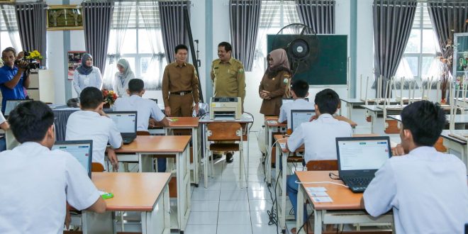 Banda Aceh – Sekretaris Daerah Aceh, Drs. Dermawan MM., meninjau pelakasanaan Ujian Nasional Berbasis Komputer di Sekolah Menengah Kejuruan di Banda Aceh, Senin 02/04/2018. Ia berharap, pelaksanaan ujian berlangsung lancar.