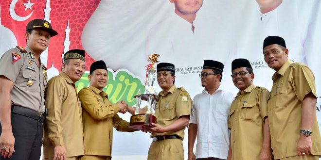 Sekda Aceh Timur, M. Ikhsan Ahyat, S.STP, M.AP, menyerahkan tropi dan uang pembinaan untuk Camat Ranto Peureulak, Saiful, sebagai Juara Umum Festival dan Syiar Islam Tahun 2017 di Pendopo Idi, Selasa 6 Juni 2017. Foto: Humas Aceh Timur