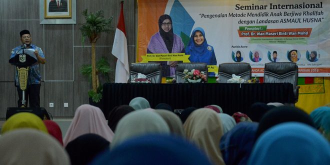 Banda Aceh – Sebanyak 270 orang peserta mengikuti Seminar Internasional pengenalan metode mendidik anak berjiwa khalifah dengan landasan Asmaul Husna di Balaikota Banda Aceh. Seminar yang menghadirkan Prof Dr Wan Maseri Binti Wan Mohd dari Malaysia dibuka oleh Asisten Perekonomian dan Pembangunan Setdakota Banda Aceh, Iskandar S Sos MSi, Sabtu (27/1/2018) di Aula Lantai IV, Gedung A, Komplek balaikota Banda Aceh.