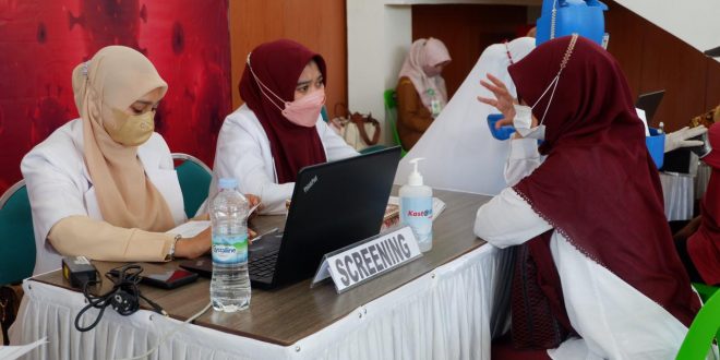 Tenaga Kesehatan saat melakukan screening kepada warga sebelum memberikan suntikan dosis vaksin Covid-19 di Banda Aceh Convention Hall, Rabu (3/11/2021).