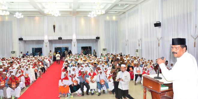 Wakil Bupati Aceh Timur, Syahrul Bin Syama’un, menyampaikan sambutan ketika Pelepasan Calhaj Kloter 11 di Asrama Haji Banda Aceh, Jumat 25 Agustus 2017 malam.