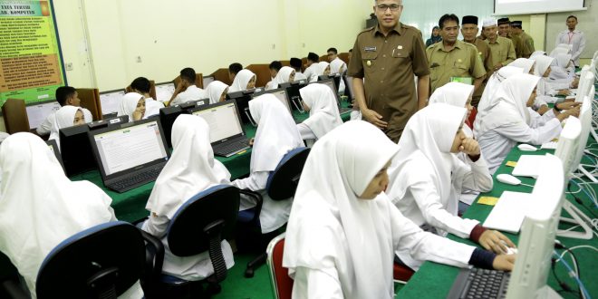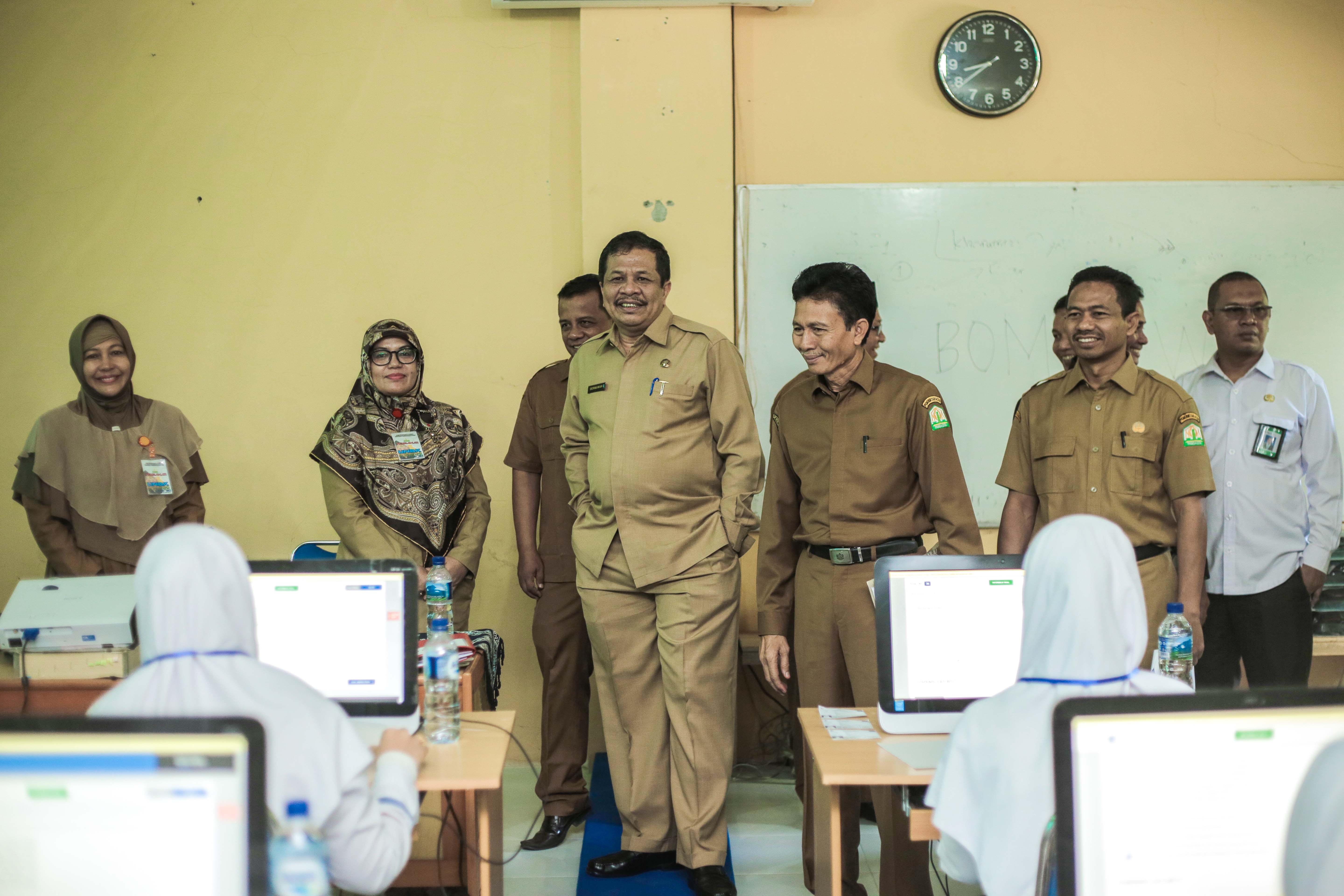 Banda Aceh – Wakil Gubernur Aceh, Nova Iriansyah, meninjau pelaksanaan Ujian Nasional Berbasis Komputer (UNBK) 2018 di Madrasah Aliyah Negeri (MAN) Model, Banda Aceh, Senin 9 April 2018. Didampingi Kepala MAN Model, Drs. Mukhlis Mpd, Wagub Aceh memasuki beberapa ruangan untuk menyaksikan langsung proses ujian yang sedang dijalani para siswa.