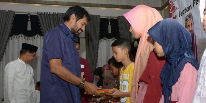 Wakil Gubernur Aceh, Muzakir Manaf menyerahkan santunan kepada anak yatim pada buka puasa bersama Ikatan Pemuda Aceh Utara di Pendopo Wakil Gubernur Aceh, Banda Aceh, 5/6/2017.