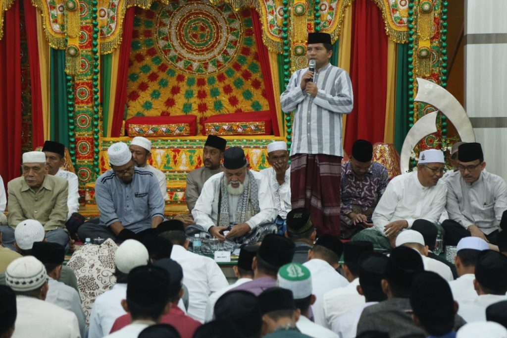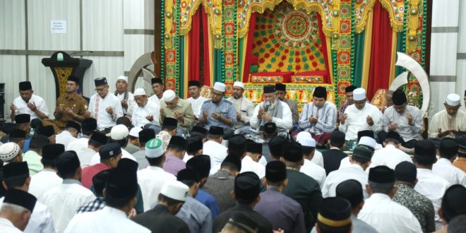 Banda Aceh – Ulama Kharismatik Aceh, Waled Nuruzzahri atau akrab disapa Waled Nu, memimpin samadiah dan doa untuk almarhumah ibunda mertua Plt Gubernur Aceh, Emmy Soekarmi binti Matsari, di Aula Rumah Dinas Wakil Gubernur Aceh, Selasa, (10/3) malam.